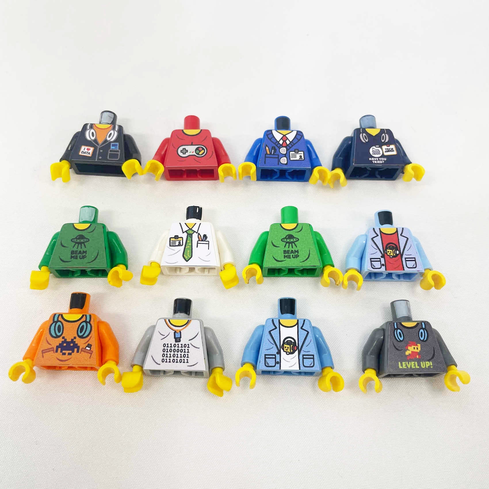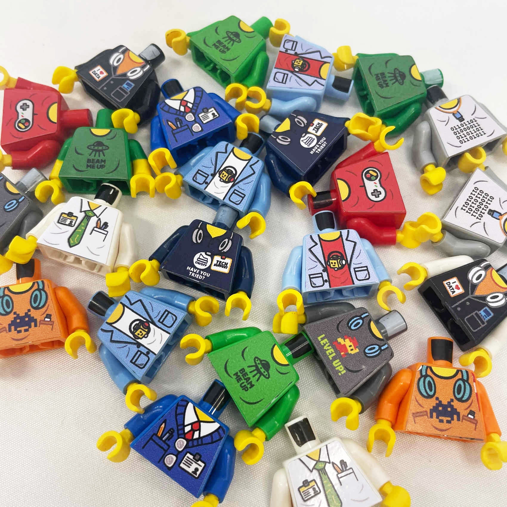 Upgrade your minifigures to match your industry of TECH, IT, pop culture or a general corporate setting, using our custom printed and applied Torso decals. We have designed these torso prints to perfectly meet the needs of our many corporate clients within the TECH & IT industries.